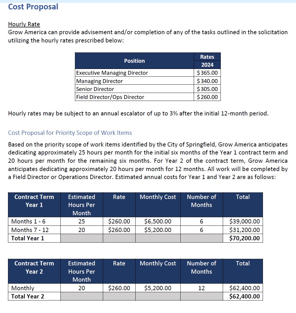 Lowest and "best" (meaning?) proposal from Grow America for $132,600 for Sep 2024 - Sep 2026 with the option to renew annually for 3 additional years