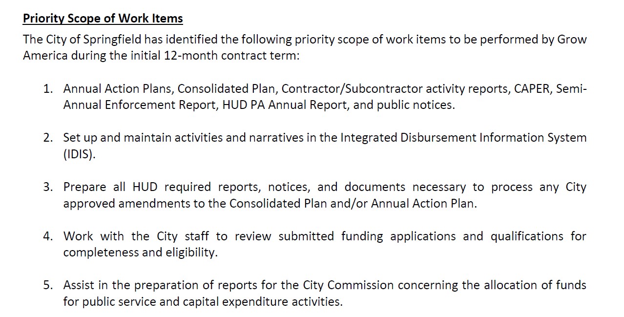 Heck's outsourcing motives are nefarious. I firmly believe the reasons for the 2025-2029 Consolidation Plan outsourcing are two-fold: 1) Logan Cobbs is inept, and 2) Grow America markets itself as a "driver of inclusive growth for distressed cities" and could potentially get Springfield what's called New Markets Tax Credit Benefits. The NMTC Program incentivizes community development and economic growth through the use of tax credits that attract private investment to distressed communities. Trust me, spending money on Grow America isn't going away anytime soon.