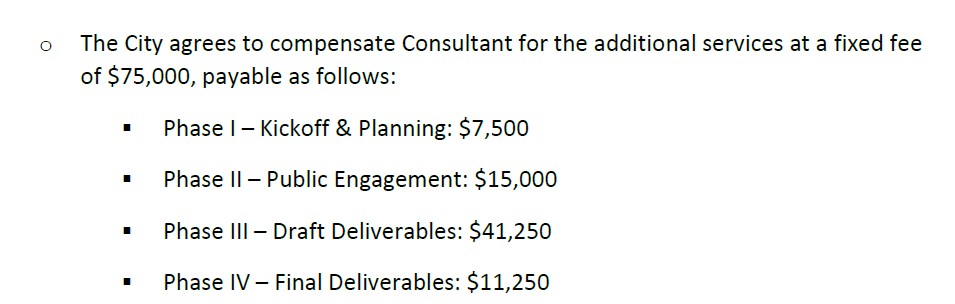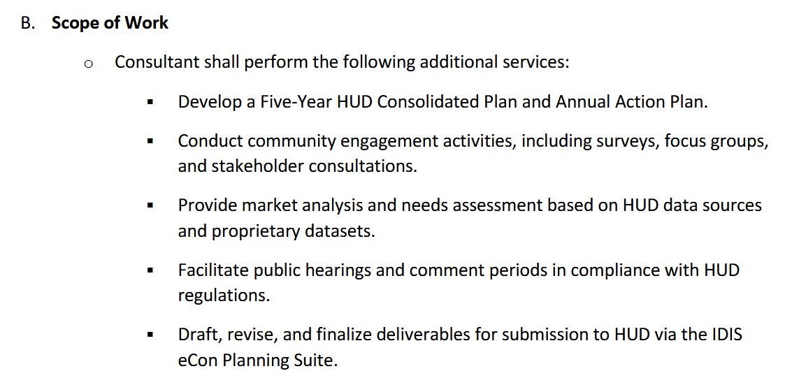 Scope change says: "shall be expanded to include the preparation and submission of the Five-Year HUD Consolidated Plan and related deliverables". Additional services (link to picture of the list is at the bottom of this page) 1) Mostly to conduct and summarize results of the Community Needs Survey ($15K charge, 589 responses) and facilitate public hearings (they announced how many?) and add results to the Plan.*