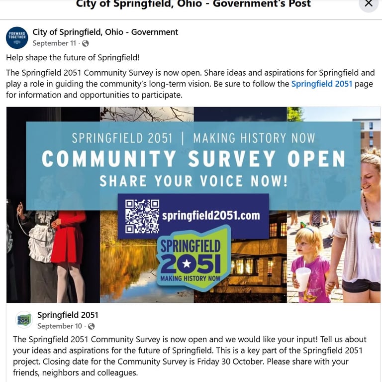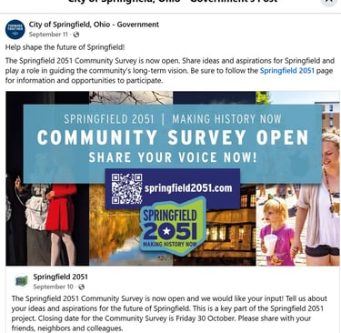 The community survey was only open May 6 to June 6,. They received 587 responses. This was all announced on Facebook where emoji interaction rarely exceeds 100 people and no comments are allowed. They held two town hall meetings - one in May and one in June - to educate the public on what can be funded under each program. Public notices were placed in the Springfield News Sun, but during the Commission meeting, Bryan Heck wasn't sure where - maybe the classifieds section?