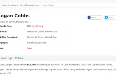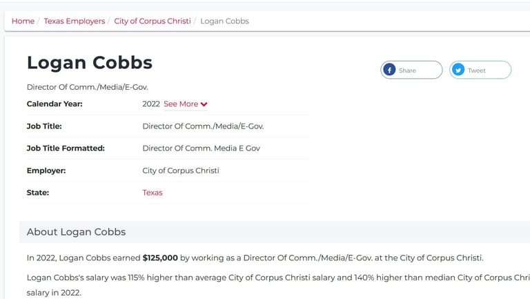 In 2023, her salary in Corpus Christi dropped to $102K and her job title changed to "N/A".In 2023, she was also listed as an Intermittent Mgmt Analyst for Springfield - probably 1099, so only a $513 salary to keep benefits/seniority?