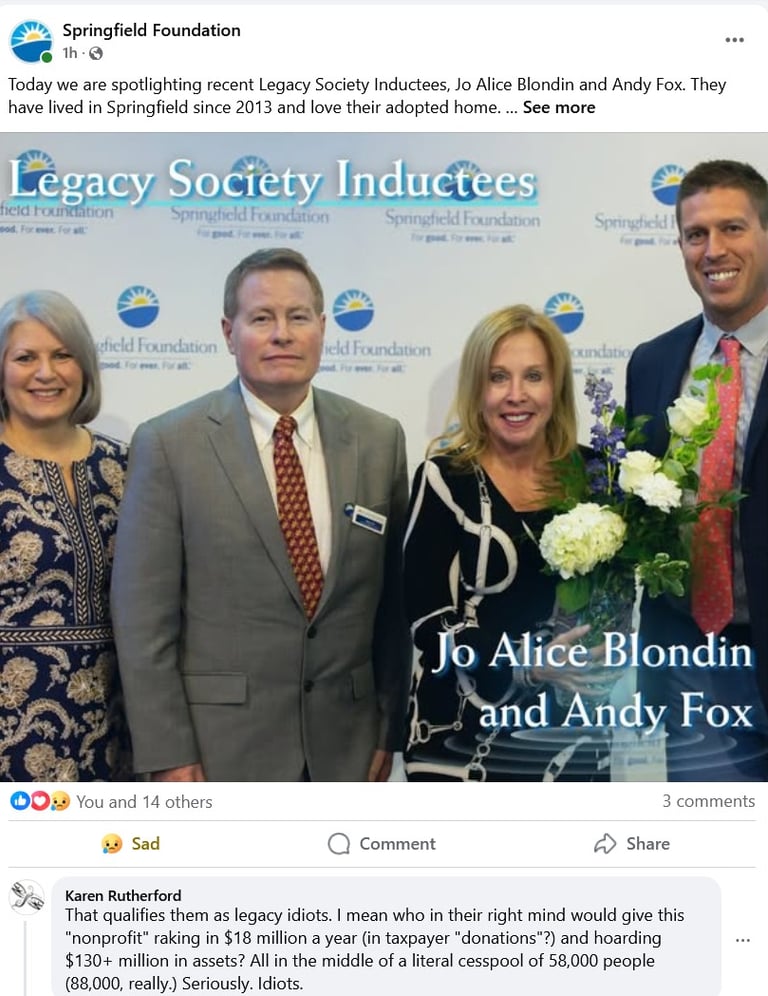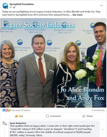 The Springfield Foundation Facebook monitor deleted my comment, of course. But not before someone actually replied with, "They only receive private donations, so I don't understand your comment."