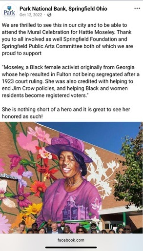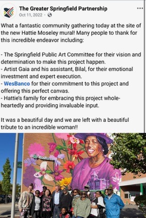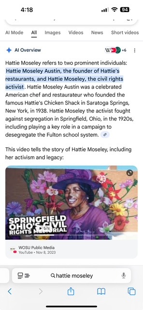 Anyway, in 2022, the Westcott House paid an artist to paint a mural on a historic building that stretches a city block downtown of a woman named Hattie Moseley. If you Google her, you will get results for a Hattie Moseley Austin who was a chicken restaurant owner in Florida. This Hattie lived from 1900 to 1998. And then you will get a few results about the Hattie Moseley mural in Springfield. Not one mention of just Hattie Moseley, only the PBS story by Tom Stafford about her mural. (See image below.) In other words, the only mentions of Hattie Moseley are about her mural.