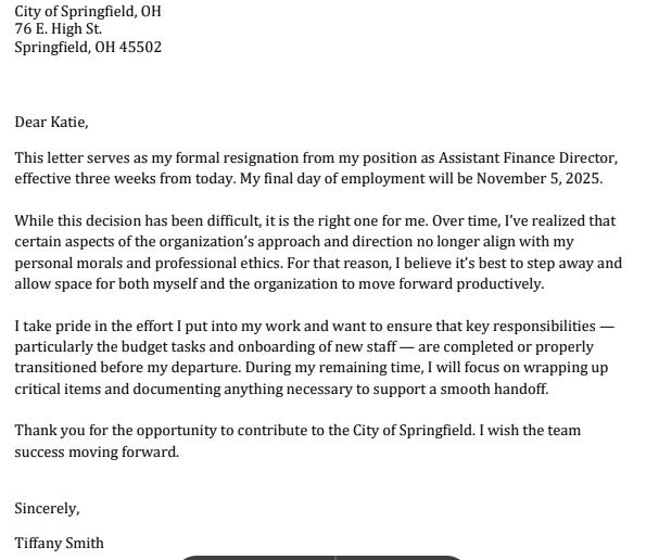 Tiffany Smith left in 2025 after being promoted in April 2025 to Assistant Finance Director (140K (per job posting) from Utility Billing Manager (90K), a sjob she was hired into in mid-2023. In 2 years, she was promoted from Billing Manager for the utilities to Assistant Director, and her salary increased $50,000. And then she quit, citing moral and ethical conflicts (see below), giving 3 weeks' notice and they escorted her from the building the next day. Per HR Director Leslie McDermott's reply to my question, "Tiffany Smith's last day in the office was October 16, 2025, and her termination date was November 3, 2025".