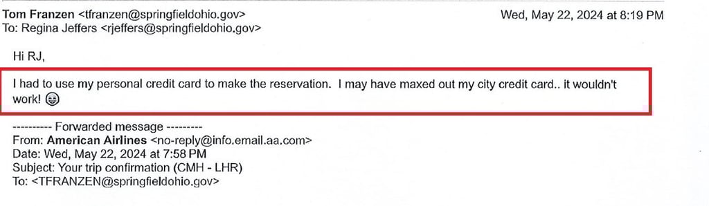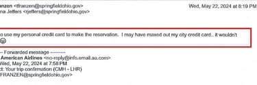 He emailed Jeffers on May 22nd that he had to use his personal credit card because his City card was maxed out. And added a smiley face in the email about that.