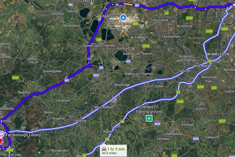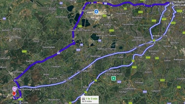 The hotel is an hour from the Farnborough International Exhibition & Conference Centre where the airshow was held (a conference center?). Map shows 51 minutes and 90 minutes, so I split the difference.