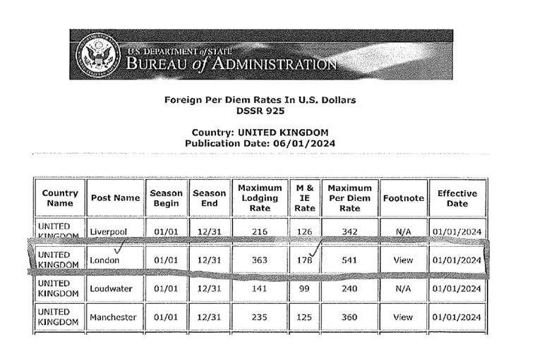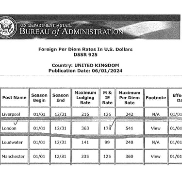 Max per diem per federal rate for meals in London is $178 per day, but the hotel included breakfast, so he charged the remaining maximums for lunches, dinners, and incidentals for a total of $1,047. The federal max for hotels is $363, but we paid $389 ($437 with taxes and fees).
